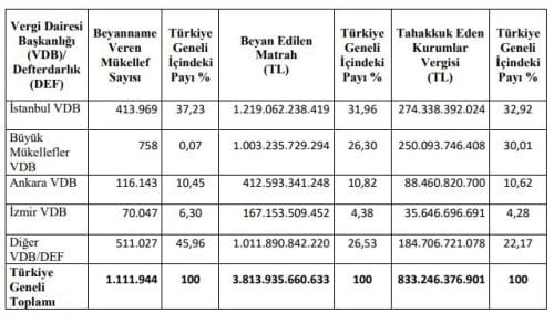 Verilen kurumlar vergisi beyannameleri ile 3 trilyon 813 milyar 935 milyon 660 bin 633 TL