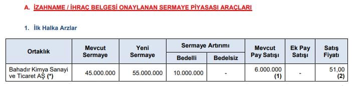 Haftalık bültene göre Mevcut ortaklardan Serkan BAHADIR’a ait 6.000.000 TL nominal değerli (B) grubu payların satışı gerçekleştirilecek ve 1 TL nominal değerli paylar 51 TL sabit fiyat üzerinden satışa sunulacağı duyuruldu.