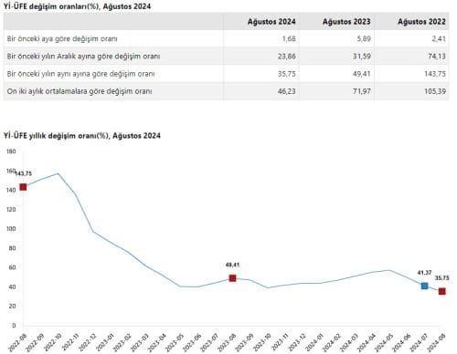 Türkiye İstatistik Kurumu ÜFE değişim 2024 yılı Ağustos ayından bir önceki aya göre %1,68 artış gösterdi. 2023 yılı Aralık ayına göre %23,86 2023 yılı Ağustos ayına yani yıllık bazda %35,75 artış gösterdi. Son 12 aya baktığımızda da %46,23 olarak gerçekleşti.