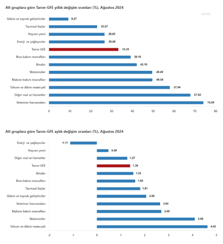 Türkiye İstatistik Kurumu (TÜİK) verilerine göre, ağustos ayında tarımsal girdi fiyat endeksi (Tarım-GFE) yıllık yüzde 33,25, aylık yüzde 1,39 arttı. Yıllık değişimin en yüksek olduğu alt grup yüzde 74,09 artış ile veteriner harcamaları, aylık değişimin en yüksek olduğu alt grup yüzde 4,62 artış ile tohum ve dikim materyali oldu.
